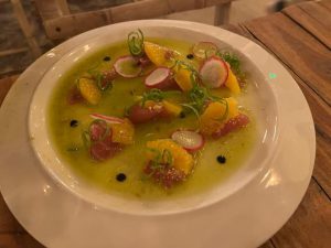 פתחנו במנות פתיחה מקוריות טעימות להפליא ומרתקות התחלנו בסלט סלק עם גבינת טולום מעל מעושנת, קרפצ’ו חציל, סלט קיסר, סאשימי טונה אדומה בשמן ירוק וסלסלת לחמים שנאפתה במקום המוגש עם טחינה. למי שאוהב סאשימי טונה זו אחת המנות המדהימות שטעמתי עם טקסטורה מרגשת בתיבול נגיעות תפוזים. מנה מעניינת מומלץ לנסות.