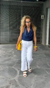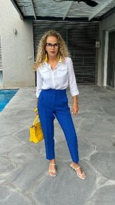 לוק חגיגי תמיד ישיג את המטרה, בחרתי חולצת פשתן לבנה עם שרוול 3/4 שמתאים לשעות אחה”צ כשמתחילה בריזה נעימה. שילבתי עם מכנסיים בצבע כחול רויאל (שזה צבע הדגל). ללוק הזה התאמתי סנדלים עדינים בצבע לבן הוספתי אקססוריז צהוב: עגילים ארוכים, צמיד ותיק. (וכמובן צבע הלק שהוא גם חלק מהאאוטפיט).