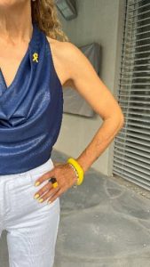 למראה ספורטיבי לבשתי ג’ינס כחול כהה וטי שרט לבנה שהם פרטי בסיס מאסט בכל מלתחה, (זהו מראה רגיל שרובנו לובשים) את הצהוב הוספתי בסנדלי עקב צהובים, עגילי חישוק צהובים וכמובן את הסיכה הצהובה למען החטופים.
