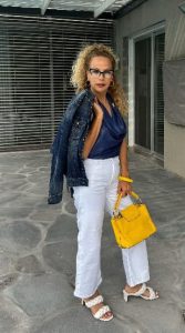 אפשר להפוך את היוצרות. כאן לבשתי את הצבע הכחול בחלק העליון ואת הג’ינס הלבן בחלק התחתון. עם הלוק הזה נעלתי סנדלי עקב לבנים ושדרגתי אותו עם אביזרים צהובים: עגילי חישוק, סיכת החטופים, צמיד, טבעת ותיק צהוב.