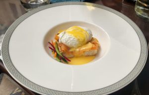 צרפתית ביצה עלומה , פרנץ’ טוסט, בצל מקורמל, סלמון מעושן ורוטב הולנדייז