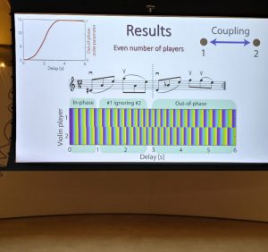 הניסוי הראה שבהתחלה כולם מנגנים כאיש אחד. מהמם בפני עצמו. בהמשך החוקרים יצרו עיכוב מסויים מכוון בהחזר של הצלילים של האחרים ובכך יצרו פער מכוון ולמעשה כאוס. מה שקרה היה שהנגנים יצרו בהמשך סנכרון מיוחד עם נגן אחד או יותר. קשה לי לתאר זאת במילים וצריך לראות את התמונות של הנגנים, את ההסבר המעמיק של ד”ר אלעד שניידרמן ואת הדוגמאות של זה בטבע.