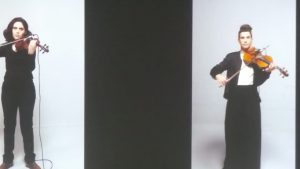 ישבנו במעין כיפה גיאודזית באולם בו ישנם 4 מקרנים או יותר ומסכים שהם קירות בתוך החלל הזה, כדי שנוכל לראות את כל הנגנים זה לצד זה. 16 נגני ונגניות כינור – אשר באורח מדעי בודדו זה מזה. הם לא יכלו לשמוע אחד את האחר ישבו בגבם למעגל ומחיצת נייר אטומה לא איפשרה להם לראות את הנגנים היושבים בשני צידיהם. נגני כינור ידועים ביכולת שלהם להקשיב ולסנכרן את עצמם בהתאם לקבוצת כלי המיתר. בניגוד לכל כלי הנגינה האחרים מגני הכינור יכולים למשוך את אורך הצליל אפילו עד 2 דקות! וגם לזהות את המקום בו נגנים אחרים נמצאים גם על פי תנועת הקשת והיד האוחזת בה. הניסוי הזה בודד את כל המשתנים האלה ואת השמיעה באמצעות אוזניות מבודדות רעש.