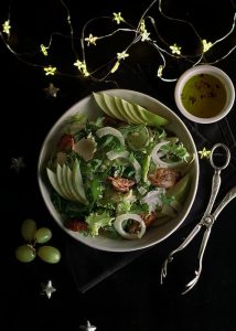 - מתבלים את הסלט עם המיונז ומוסיפים את חתיכות תחליף העוף. מגישים עם פרמזן טבעוני, כמה ענפי שמיר טרי (אם רוצים), כמה גרגרי רימון ומעט שמן זית כתית מעולה.