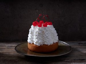 יש להקציף את כל החומרים עד קבלת קצפת יציבה. יש להניח את הסברינה על צלחת, להעביר את הקצפת לשק זילוף עם צנתר משונן, לזלף רוזטות מעל הסברינות ולמעלה להניח דובדבן.