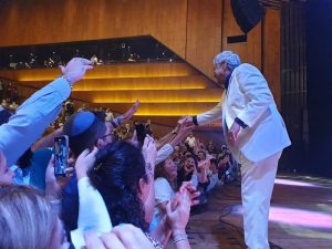 לקראת השיר האחרון רבים מן הקהל נהרו לקדמת הבמה, הצטרפו אליו בשירה ונופפו לו בידיהם. הוא רכן ועבר, לחץ ידיים וחייך לכולם. אישה מבוגרת נגשה למרגלות הבמה והגישה לו זר פרחים ענק. ילדה קטנה עלתה לבמה והגישה לו זר נוסף. הוא ירד מהבמה ושב אליה פעמיים, ובכל פעם קד בפני הקהל, המשיך ללחוץ ידיים ולהודות.
