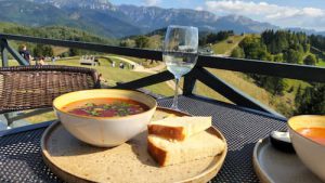 על ההר תראו עגלת בירות וקפה סלסלות קש גדולות לצילומי סלפי. ישבנו עם בירה מקומית קרה והשקפנו ללא הרף על הנוף שמעולם לא ראיתי כזה על התצפית ממוקמת מסעדה יש להירשם אליה תחילה כי התור ארוך מאוד. הזמנו מרק ירקות רומני מסורתי לצד יין לבן, תוך כדי האכילה, השקפנו על הנוף המרהיב, אלו הם רגעים של פסטורליות עוצמתית.
