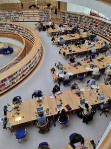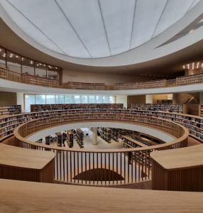 גרמי המדרגות הספירליים, ספסלי העץ בחזית הבניין ובאולמות הקריאה- אלמנטים שחוזרים על עצמם בהרבה מהפרויקטים שהמשרד השוויצרי תכנן בחו”ל. המבנה קיבל את הדרוג הגבוה על פי התקן האמריקאי לבניה ירוקה – Leed Platinum. התאורה הטבעית שנכנסת דרך הסקיילייט העגול והגדול במרכז הגג, חודרת לשלושת קומות אולמות הקריאה עד לקומות המרתף עמוק באדמה. עיצוב הפנים משרה אווירת הוד ורוגע כיאה לספריה לצד אדריכלות מודרנית.
