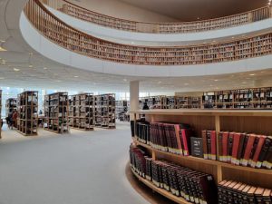 מרבית הספרים ממוקמים במטמון-מחסן הספרים הרובוטי המאפשר נגישות לפריטים הרבים שמאוחסנים עמוק בקומת המרתף העצומה- בתוך דקות מרגע שנתבקשו על ידי הקוראים, הסטודנטים או החוקרים. הספרייה משתרעת על שטח של 46,000 מ”ר ב- 11 קומות מהן 5 מתחת לפני הקרקע ומכילה כ- 5 מיליון ספרים ועוד כ- 3 מיליון פריטים היסטוריים, תצלומים, עיתונים, כתבי יד, מפות ואוספים ארכיונים מגוונים. אולמות הקריאה יכולים להכיל כ- 600 קוראים בו זמנית.