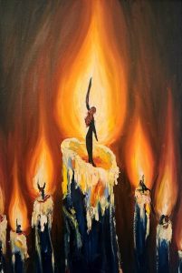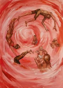 האמנית מרים שטרמן מציגה בתערוכה מספר יצירות ובהן: Harpy”” – ציור בהשראת ליתוגרפיה של אדוורד מונק. ביצירה המקורית מופיעה דמותה של הרפיה מרחפת מעל דמות שלדית. היא הוסיפה דמות מלאך אבלה, המקוננת על גופת המת, כשלא ברור האם ההרפיה מגוננת על המלאך או מתכננת לסיים את חייה. ביצירה “Abandonment” מופיעה דמות שוכבת מוקפת בהררי גולגולות קטנות. מצד שמאל יש צללית אפלה או רוח רפאים, המהווה דימוי מופשט של המוות עצמו. היער שמאחור, החשוך והדומם, מרמז על תחושת ניתוק ועזיבה. אין כאן שום סממן חיים – רק עצים צחיחים שמדגישים את תחושת החידלון. Untitled”” – בציור מופיעה דמות מלאכית הנראית תלויה בין שמיים לארץ. הרקע הכחלחל והמעורפל סביב לדמות נותן תחושה של תנועתיות, של מעבר בין עולמות. הדמות השלדית ברקע מייצגת את המוות הקרב”.