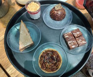 מנות קינוח: פאי הפקאן היה מתוק ועשיר, עם הקראמל המרענן והאגוזים הפריכים המעניקים טקסטורה מקסימה. כדור הרושה קריר וקליל יצר נגיעה קלאסית ורומנטית. והקראנץ’ בייגלה נגיעה מקורית של מתיקות מלוחה. אבל מה שבאמת גרם לי להזיל ריר זו פלטת הפירות המשובחת רק לדמיין את המבחר הרענן והטרי של אננס, ענבים כהים, תפוחים עסיסיות. פינוק של ממש לחיך. אני מציינת שהפעם לא היססתי לטעום הכל  וזה מעיד מבחינתי על המסעדה האיכותית והמפנקת. מי לא יתפתה לקינוחים כאלה? הם נראים כמו חגיגה חושית של טעמים, צבעים וטקסטורות.