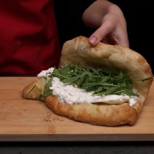 - למלא עם בורטה סטרצ’יאטלה, ואגוזי פיסטוק מעל. לסיים עם שמן חריף, רוזמרין וסלט רוקט.Top of Form