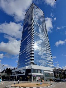 2. מגדל הכשרת היישוב– בני ברק. כחלק ממתחם הסיטי של העיר בני ברק. מגדל בן 40 קומות. גווני הזכוכית הכחולים של חלונות המשרדים משתלבים עם המסגרות הלבנות בין הקומות. השמים הכחולים והעננים החורפיים הלבנים מוסיפים את שלהם..