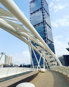 1. גשר יהודית החדש (גשר יצחק נבון) תל אביב – גשר להולכי רגל מעל נתיבי איילון, שמקשר את שכונת מונטפיורי במערב ושכונות ביצרון ושארית ישראל במזרח. הכחול של מגדלי המשרדים ברקע והלבן הבוהק של צינורות הגשר הענקיים. העננים האפורים בשמים משמשים תפאורה מושלמת.