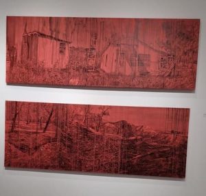 תערוכה הראשונה: האמנית זיוה ילין מקיבוץ בארי- מכונה “צללי הברושים על הכביש”, אותו כביש ארור ששימש את חברי הקיבוץ בימים אחרים להגיע לחדר האוכללבתי החברים, לפעוטונים ולגנים.אותו כביש ארור שימש את המחבלים הארורים להכנס לקיבוץ השלו לרצוח,לטבוח,וגם לשרוף. למרות שהסדנא של האמנית נשרפה בחלקה היא בחרה לחזור ולצייר בה ולהתחבר לעבר ולזכרונות.ציוריה גדולי הממדים,שוזרים רבדים שונים של חוויה אישית וקולקטיבית, לידי שפה אמנותית,שהיא אוניברסלית ובד בבד מקומית.הצבעים הכחולים והאדומים השולטים בציוריה הם עזים ונותנים לצופה תחושה שהוא היה שם וחווה את הטראומה אישית. זכרונות מהקיבוץ של פעם המשתלבים בזכרונות הטראומטיים של השנה הנוראית שחווינו כולנו.תמונה של חורשת הברושים אז והיום.תערוכה מרגשת ומרשימה.