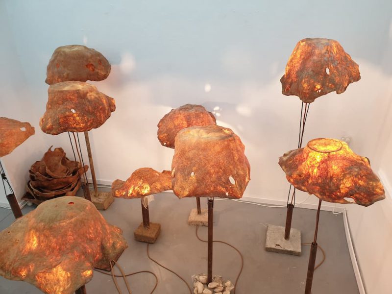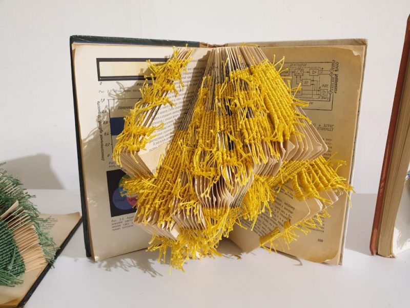בין העבודות הרבות צדו את עיני בין היתר ספרים רקומים של האדריכלית והאמנית מירב כהן, שמגדירה את הספרים עליהם עובדת ‘ספרים נטושים’ – כאלו שנזרקו ונאספו מחדש. את מירב פגשתי באולפן רדיו קסם, בתכניתי ‘אמנות זה הקול’. לצידה באולפן ישב אלי סער מסטודיו מולט – שותף ומייסד, מעצב ומנהל שיווק ומכירות שיחד עם אנשיו היו אמורים להרים מייצג גדול בכניסה לתערוכה, מבוסס על משטחי עץ ממוחזרים. אולם לקורונה (כן, היא עדיין כאן, קטנה יותר ושונה) תכניות משלה, וימים ספורים לפני פתיחת התערוכה צוות העבודה נדבק במחלה, והמיזם לא יצא אל הפועל.