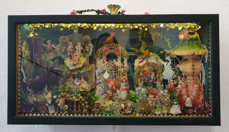 עבודה נפלאה של מיכל נגרין, שהוכנה במיוחד עבור התערוכה, כולל ארגז ממוסגר ובתוכו עולם קסום של דמויות מתוך גלויות חג עתיקות יומין (1800-1900) שהודפסו באופן ידני ונרכשו בשווקי פשפשים ברחבי העולם, לאורך השנים. אם בתערוכות אמנות אנו רגילים ‘לשמור מרחק’ בין היצירה, לא לגעת בה חלילה ולעיתים לא להתקרב אליה יתר על המידה, הרי שבתערוכה המדוברת, בחלק מן העבודות, מוצע למבקרים להתקרב, לגעת, למשש.