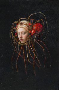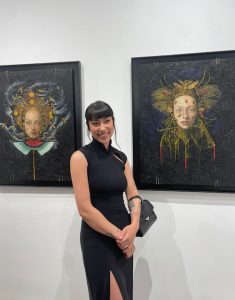 החזרה שלה שוב לעולם האמנות הפלסטית אחרי שסיימה 4 שנים בסטודיו התחנה הייתה גדולה ומסחררת. “זה קרה ממש בשנה האחרונה. ניסיתי להתקבל לצבע טרי ואכן התקבלתי. היו לי הרבה עבודות, אף פעם לא הצגתי אותן. הן היו עבודות למגירה, לא העזתי ולא חשבתי שאני יכולה.”בצבע טרי הציגה 8 ציורי שמן קטנים ו-12 ציורי פחם. “ליצירות קראתי ‘אנושיות לשימור’. הן מציגות נשים רנסנסיות משולבות עם חרקים. ההשראה האסתטית נלקחה מהתרבות המצרית.”המלחמה גם היוותה גורם משמעותי. “אך גם המלחמה היוותה גורם משמעותי, הפחד מהמוות ומצד שני גם הפחד לחיות ולהזדקן. ההבנה שאין לנו שליטה, ואולי הייתי רוצה להישאר באיזה שיא של אידיאל היופי, כמו שמשמרים חרקים במוזיאונים, בשיא היופי שלהם, וכך להנציח את הזמן כפי שעשו בתרבויות עתיקות, כפי שהיינו רוצים להיזכר.”קישוט וקיטלוג הם נושאים חוזרים אצלה בעבודות. “בשימוש בצבעים מטאליים אני מרגישה שאני מתכתבת עם האסתטיקה המצרית תוך שימוש בפנים רנסנסיות שאני מצלמת או מציירת באמצעות בינה מלאכותית. בשני המקרים יש שיא יופי שמעורר השראה ורוגע.”היא מסבירה את הניגוד שבעבודותיה: “אמנם הציורים שלי מדברים על קיטלוג, התכלות, מוות וזקנה, כשמתבוננים בציור רואים יופי אסתטי, נשים יפות, חרקים צבעוניים, תכשיטי גוף, כפי שאנו חיים את חיינו ורוצים להקיף את עצמנו בטוב. כך אני מתמודדת עם הכאב. במילים קשה מאוד להעביר תחושה, בציור אני יכולה ליצור ולהרגיש שחלק ממני מספר סיפור ללא מילים.”