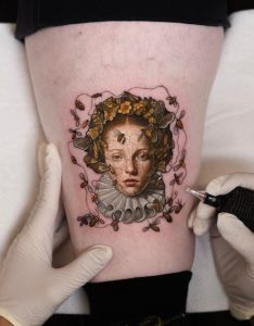 היופי האידיאלי ביצירות שלה מופיע בדרך כלל בפנים התמימות הרנסנסיות שמסמלות את תקופת שיא היופי, גם באמנות. “החרקים מסמלים את היופי של הטבע. אין לחלקים סימנים של זקנה, וניתן לשמר אותם. ולכן החיבור הרגיש לי מאוד נכון.”החיבור של הקלאסי למודרני בצורה סוריאליסטית מאפשר מבט שונה. “אני מציירת לפי כל החוקים של ציור קלאסי ורק בסוף היצירה אני מוסיפה את הצבעים המטאליים, את הגושים של הצבע הבולט, את הפן התכשיטני היותר צעקני ואגרסיבי כדי לתת את החיבור הניגודי.”הרבה לקוחות שלה שראו את היצירות שלה רצו גם לקעקע אותן. “זה היה מדהים, ליצור ציור ולאחר מכן לקעקע אותו. חיבור מדהים לשני העולמות שהם בלתי נפרדים ממני, ממי שאני. אצלי זה הולך יד ביד.”ציור לוקח לה בדרך כלל כמה חודשים של יצירה לעומת קעקוע שהיא חייבת לסיים ביום אחד. “בדרך כלל עד שבע שעות כדי לא לגרום נזק לעור. אני מאוד אוהבת את הניגוד הענק הזה במדיומים.”בעבודה מול ציור שמן היא לבד עם עצמה, יכולה לשנות דברים תוך כדי תהליך. “לעומת קעקוע, זו עבודה מול לקוח באופן ישיר כמו טיפול פסיכולוגי. החיבור עם הלקוח הוא חלק מהיצירה. והלקוח חייב לדעת מה הולך לקרות בסוף העבודה.”ההבנה וההפרדה בין המדיומים היא שמאפשרת לה את הצמיחה בשני התחומים. “אמנות הקעקוע ואמנות הציור הפלסטי שונה אך דומה. מעולם לא הכרתי אמן קעקועים שמשתמש בטכניקה של ציורי שמן כדי לבצע קעקוע. ומעולם לא הכרתי צייר שמשתמש בשרטוט של נייר קופי כדי לצייר יצירת שמן. אולי יש אך אני לא מכירה.”הכוונה שלה היא שהיא ממציאה את עצמה בשני התחומים הכל כך שונים בעזרת לקיחת כלים וידע והשראה גדולה אחד מהשני.