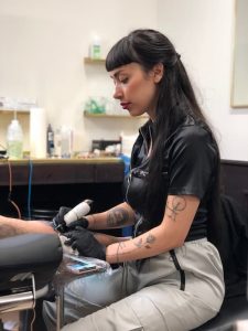 בתקופת הצבא התחילה את המסע שלה אל עולם הקעקועים. “הייתי מדריכה בצבא, מה שאפשר לי ללמוד לקעקע תוך כדי. באותה תקופה לא היו כמעט בכלל מקעקעות נשים, אך איכשהו התחום הזה משך אותי אליו.” מה שמשך אותה היה הפרימיטיביות של הסימבול על הגוף וקישוט הגוף. “זה תמיד הזכיר לי את התקופות הפרהיסטוריות. זה תמיד התרכז אצלי באסתטיקה של קישוט כמו במצרים העתיקה, אם כי הוא לא היה קונבנציונלי באותה תקופה כפי שהוא היום.” היא הייתה הולכת לצבא בבוקר ולומדת לקעקע בערב בחיפה. “באותה תקופה אנשים היו מגיעים ובוחרים קעקוע מתוך חוברת ולאמן קעקועים הייתה פחות התערבות בתהליך ולכן החלטתי שזה לא בשבילי. לא הרגשתי את תחושת הסיפוק.” לאחר הצבא עשתה תואר ראשון באמנות במכללת אורנים שבטבעון. “הייתי תלמידה של אלי שמיר הנפלא, כך שוב חזרתי אל עולם האמנות הפלסטי וכמובן שבחרתי להתמחות בציור קלאסי.” בפרויקט הגמר שלה עשתה ציורי שמן על עץ של איברי גוף פנימיים. “המחשבה הייתה בעיקר על חניטה, שימור, קיטלוג. בעיקר בתקופה של הלימודים ציירתי על עץ. אבא שלי היה נגר והמדיום העיקרי שלי היה עץ. הייתי מבקשת ממנו גדלים, חיתוכים, סוגים שונים של עץ, ואבא תמיד היה עושה.” הקשר עם אביה היה המנוע שלה. “הייתי מדורבנת בעיקר מהגאווה שלו, מהעידוד שלו. הוא תמיד התגאה שאני לומדת ועושה תואר כי הוא לא הצליח. הוא עלה ממרוקו והיה חייב להמשיך את העסק המשפחתי.” אביה היה מגיע לכל תערוכה, תולה, עוזר, נושא. “הוא היה תמיד הדמות המרכזית בחיי, שאיתו הייתי מדברת על הכל. ולפני 7 שנים נפטר ממחלת הסרטן. היום אני עדיין מציירת רק על עצים, בעיקר כדי להמשיך את השיח איתו.”