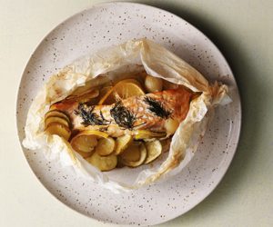 - הניחו במרכז הירקות שבכל גומת נייר נתח סלמון טרי ושטוף.