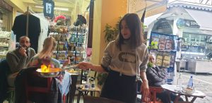 לפני חזרה הביתה, התחשק לי להיכנס למסעדה אותנטית בשוק. הסתובבתי מעט עד שעיני תפסה בתוך השוק מסעדה קטנטנה, עם מוזיקה יוונית ומלצרית שמנופפת בדג מקרל מעושן במחבת עם אש. החלטתי שזה המקום שאני רוצה לחוות.