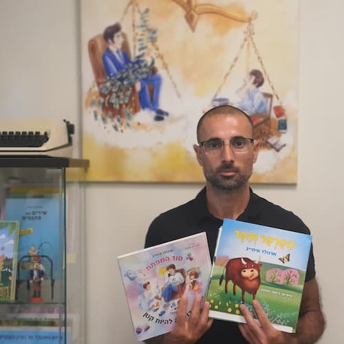 ארנולד איחייב עם ספריו סוד המפתח והפרפר והפר, צילום: יהורם גלילי