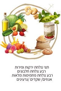 חצי צלחת ירקות ופירות רבע צלחת חלבונים רבע צלחת פחמימות מלאות אגוזים/ שקדים /גרעינים