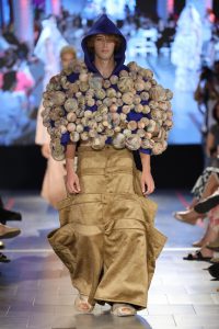 פליטים של אהבה | ניקול ח’יאט – הקולקציה מציפה בעיה חברתית של זוגות מעורבים מדתות שונות בחברה הערבית. שפת העיצוב משלבת את בגדי החתונה המסורתיים עם השפה הייחודית והפונקציונלית של בגדים ואביזרים מעולם הטיילים והנוודים ומייצרת תוצאה שבה הבגד הוא גם הבית והאוהל הארעי שנודד איתם.