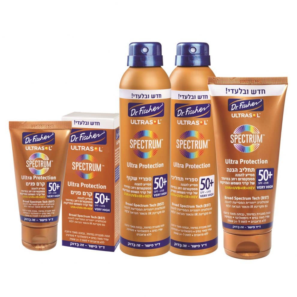 סדרת אולטרסול SPECTRUM הינה סדרה פורצת דרך המבוססת על טכנולוגיה ייחודית, המסייעת לראשונה גם בהגנה מפני קרינת HEV (High Energy Visible light) – קרינת האור הנראה באנרגיה גבוהה. הטכנולוגיה מסייעת להגנה מספקטרום רחב במיוחד של קרני השמש המזיקות UVA+UVB+IR+HEV. מחקרים שפורסמו לאחרונה מעידים על נזקים הנגרמים לעור גם מחשיפה לקרינת HEV המעודדת יצירת רדיקלים חופשיים מזיקים הגורמים להזדקנות מוקדמת של העור, להיווצרות כתמים, קמטים ולרפיון עור. השנה מציעה ד”ר פישר את תכשירי הסדרה בהגנה מוגברת במיוחד של SPF50+.