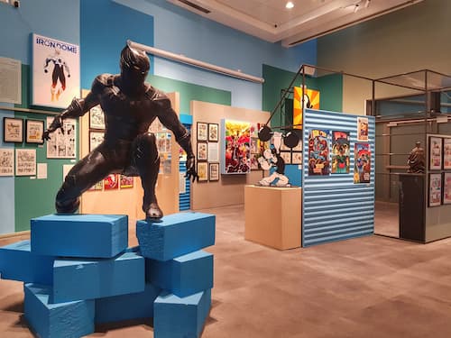 חדר גיבורי העל שלנו – מראשית הופעתם בקומיקס, בטלוויזיה ובקולנוע, מילאו גיבורי העל צורך בסיסי של מיליוני בני אדם. הם אפשרו להימלט מן הניכור, מהמלחמות ומחרדות היום-יום של העולם המודרני אל עולם פנטסטי שבו נפתרים דברים באורח פלאי ושהצדק והטוב מנצחים בו תמיד. ובכל זאת, גיבורי העל של תקופתנו מאופיינים בתכונות המבדילות אותם מגיבורי המיתולוגיה. סופרמן, באטמן, ספיידרמן, קפטן אמריקה ואחרים ניחנו כולם ביכולת על-טבעית אחת לפחות, המבדילה אותם מהאנשים הרגילים. הם סיכלו את מזימות הרשעים ברגע האחרון כמובן וחשוב מכל – הם עמדו לשירות האנושות כולה בכל מקום בעולם. התערוכה ״גיבורים כחול-לבן״ מצדיעה להם ומזכירה לנו שאנחנו אומנם נראים רגילים אבל אנחנו עם של גיבורי על.גיבורי החיל וגיבורות המלחמה -מאז השבעה באוקטובר 2023 נגדעו בטרם עת חיי היצירה של אמנים ואמניות צעירים וכישרוניים. התערוכה מציגה איורים, עבודות קומיקס וקריקטורות של גיבורים וגיבורות שהזכות לחיות חיים של יצירה וכישרון נלקחה מהם באכזריות. התערוכה מבקשת להנציח את היוצרים והיוצרות, להכיר לקהל את הכישרונות הייחודיים שאבדו ולהעניק להם את הבמה הראויה. המוזיאון פנה למשפחות השכולות והן ניאותו להשאיל את היצירות המקוריות והיקרות מכול. בתערוכה יוצגו עבודותיהם של ענבר הימן (PINK), רויטל ברונשטיין (Navy Bird), ניב תל צור, יונתן חצור, ענר שפירא, גיא עזר ואיל מאיר ברקוביץ זכרם לברכה. חדר גיבורי התנ”ך – דמויות תנ״כיות כמו שמשון הגיבור, דוד המלך ומשה רבנו היו השראה לדמוית המופיעות בתערוכה ״גיבורים כחול לבן״.