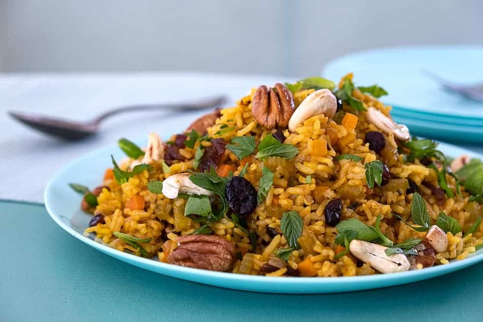 5.מעבירים את האורז המבושל לצלחת הגשה, מפזרים אגוזים קלויים ועשבי תיבול קצוצים ומגישים.
