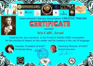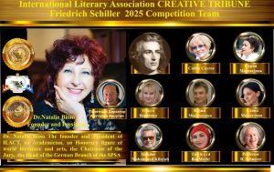 האגודה הספרותית הבינלאומית “CREATIVE TRIBUNE” גרמניה, המייסדת והנשיאה ד״ר נטלי ביסו והמנהל של הכבוד אנאטול אורוצינה,התחרות הספרותית הבינלאומית על שם פרידריך שילר 2025 במסגרת האגודה הספרותית הבינלאומית “הבימה היצירתית” (MLATT/ILACT) האגודה הספרותית הבינלאומית “הבמה היצירתית” מברכת אתכם על הניצחון ומודה לכם על השתתפותכם הפעילה בתחרות פרידריך שילר 2025,השנה התחרות גדלה במשתתפים חדשים וכללה יותר מ־40 מדינות ברחבי העולם