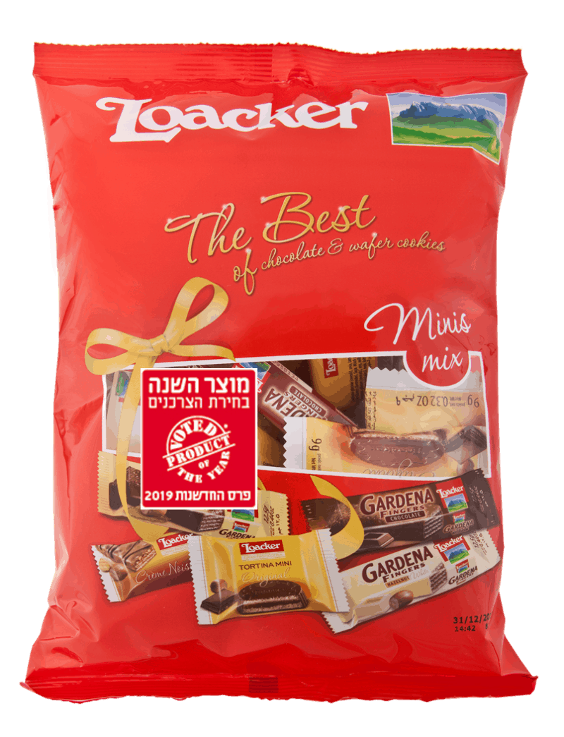מארז The Best of Loacker, זוכה פרס מוצר השנה 2019, מכיל 210 גרם של מיני חטיפי לואקר מובחרים ביותר – חטיפי וופל ממולאים ומצופים שוקולד חלב, שוקולד מריר ושוקולד לבן, בהם: טורטינה, גרנד פטיסרי אגוז , שוקולד לואקר מריר וגרדנה ב-3 טעמים: אגוז, שוקולד חלב ושוקולד לבן.