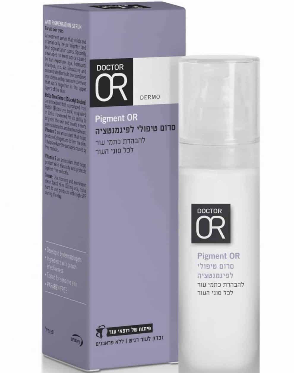 Pigment OR סרום טיפולי לפיגמנטציה של דוקטור עור, סרום טיפולי המסייע בהבהרה ובטשטוש של כתמי עור באופן משמעותי ונראה לעין, אשר פותח במיוחד לטיפול בכתמים הנובעים מחשיפה לשמש, גיל, שינויים הורמונליים ועוד. נוסחה חדשנית ומרוכזת במיוחד המשלבת רכיבים שיעילותם מוכחת הפועלים יחד בשכבות העליונות של העור.