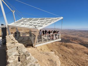 תצפית עוצרת נשימה על המכתש המרהיב, טיילת לכל אורך המכתש המגיע עד הר גמל בהמשך המסלול מוצבים פסלים.