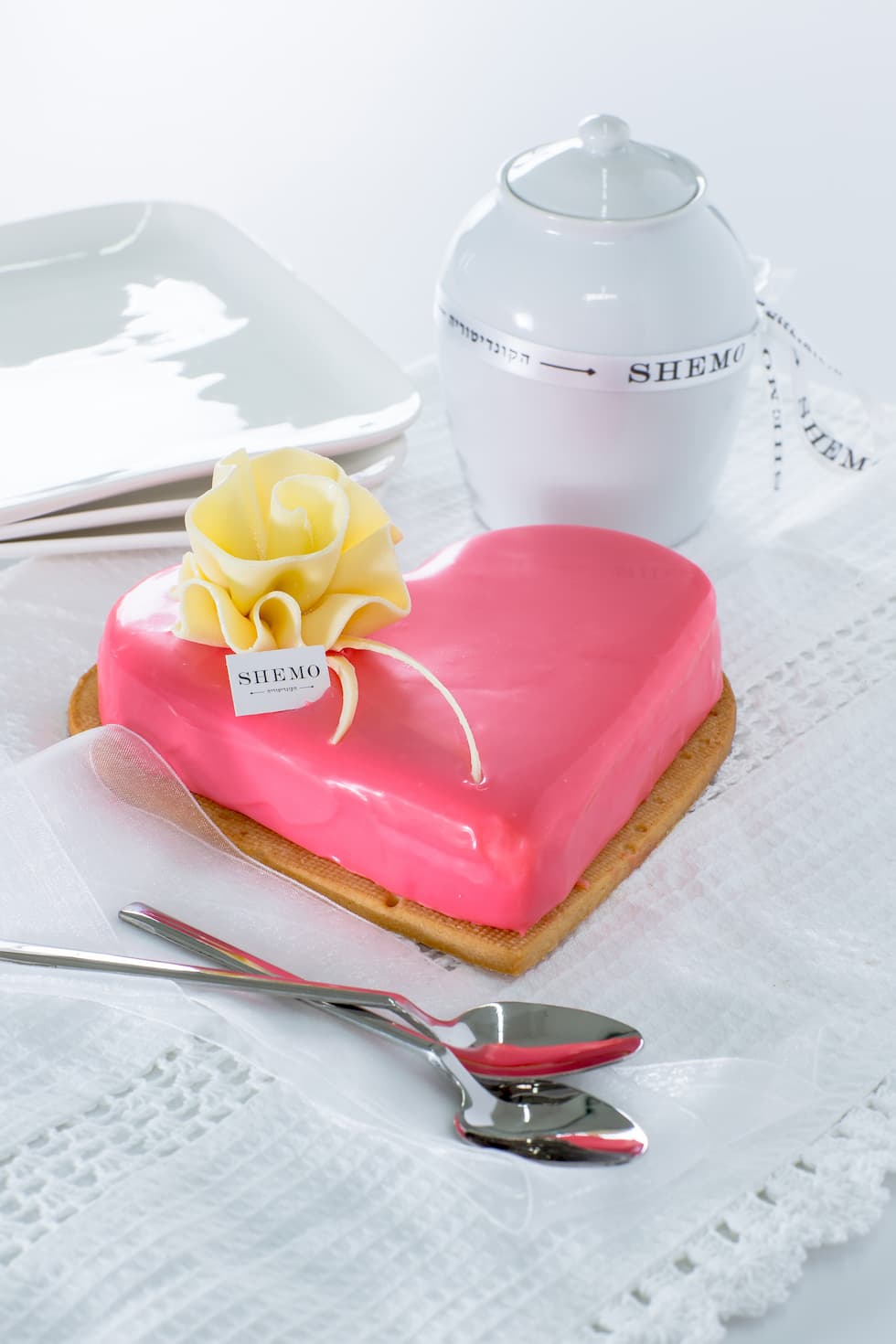 לב אדום- עוגה על בסיס טורט לבן עם מוס שוקולד לבן עם שכבת קולי תות/ פטל בציפוי אדום (150 ₪)