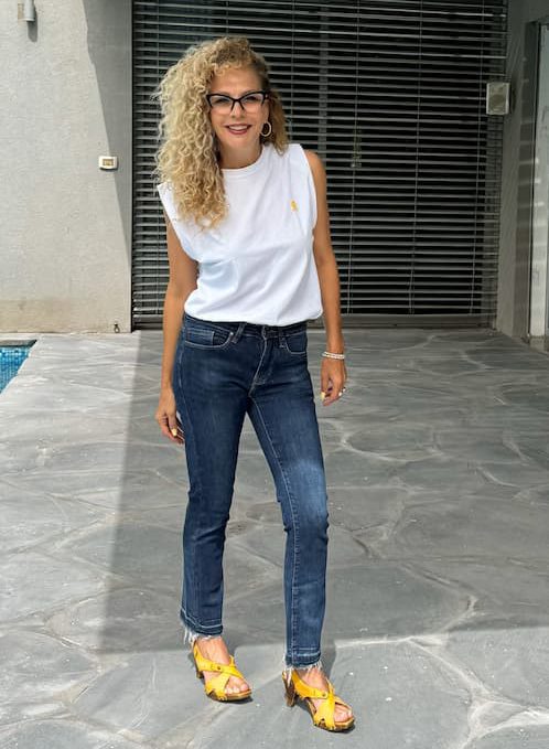 למראה ספורטיבי לבשתי ג’ינס כחול כהה וטי שרט לבנה שהם פרטי בסיס מאסט בכל מלתחה, (זהו מראה רגיל שרובנו לובשים) את הצהוב הוספתי בסנדלי עקב צהובים, עגילי חישוק צהובים וכמובן את הסיכה הצהובה למען החטופים.