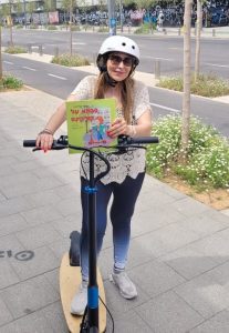 “זו סבתא מצחיקה ומשעשעת, שוברת כל סטריאוטיפ של סבתא שאנו יכולים לחשוב עליו, והיא מעבר לכל העניין של שיח על גילנות. כן דאגתי שיהיה לה קורקינט, שהוא כלי רכב שבעיקר צעירים רוכבים עליו וכמעט שאין רואים מבוגרים הרוכבים על קורקינט. פעם כתבו סיפורים על ‘סבתא שבישלה דייסה’, כיום הסבתות בסיפורים רוכבות על קורקינט וחיות על פי דרכן. הסבתא בסיפור שלי שוחרת חופש, וכשהיא לא מבלה עם נכדותיה, היא מסתובבת עם בעלי החיים שלה. זו סבתא פוסט פמיניסטית, שחיה חיים ירוקים, מודעת לאיכות הסביבה העירונית, ולכן ממירה את מכוניתה בכלי רכב דו-גלגלי כשהיא מקפידה לרכוב רק בשבילים ירוקים. היא אומרת שהיא צריכה חבר או חברה, וכך היא מתייחסת לקורקינט. כלומר גם עניין המגדריות מבצבץ בסיפור, והקורקינט מבחינתה הוא חבר וגם חברה. אז היא קונה באינטרנט קורקינט יד שנייה, במטרה לשמור על איכות הסביבה ומתקנת אותו: מחליפה מסגרות, מחזקת גלגלים, צובעת אותו במיני צבעים וזה מסב לה אושר”.
