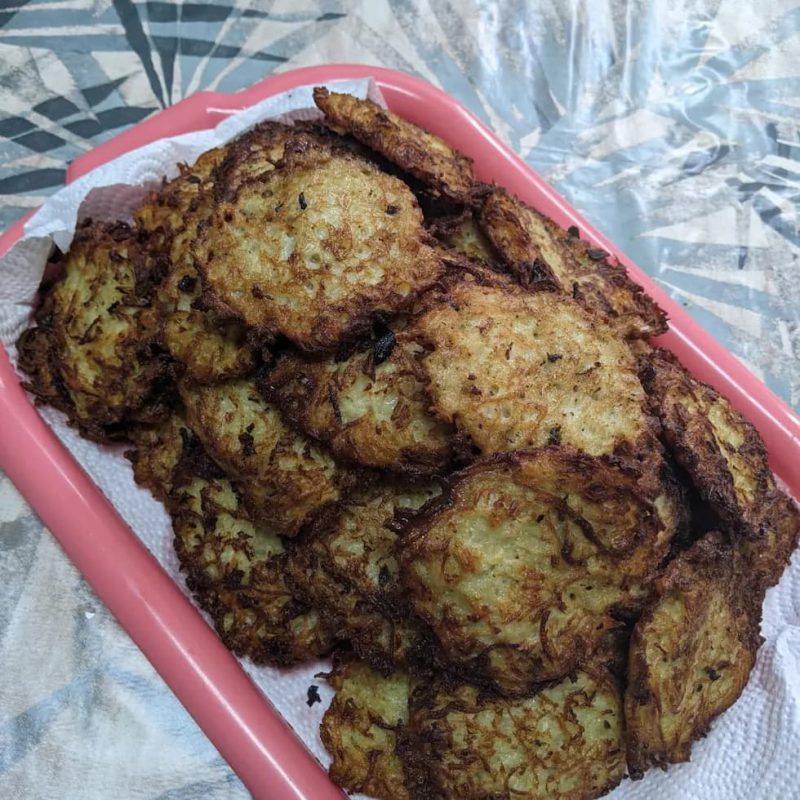 לגרד את התפוחי אדמה בפומפייה גסה כנ”ל את הבצלים לסחוט את הבצל ואת התפו”א לשים את הכול בקערה להוסיף את הביצים את התבלינים ואת הקמח לערבב היטב לבדוק את התיבול .לחמם מחבת עם שמן לא עמוק ובעזרת כף לצקת מהעיסה ולטגן משני הצדדים..