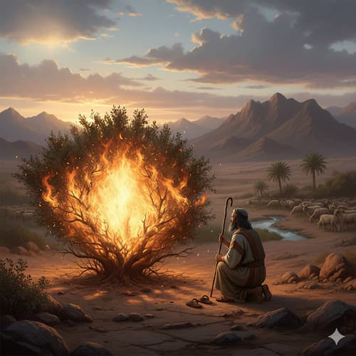 משה היה רועה צאן של יתרו: “וּמֹשֶׁה הָיָה רֹעֶה אֶת־צֹאן יִתְרוֹ חֹתְנוֹ כֹּהֵן מִדְיָן”, וכדי להימנע ממצב שהצאן ירעה בשדות אחרים, מצב הנקרא: גזל, הוא הוביל אותם למדבר: “וַיִּנְהַג אֶת־הַצֹּאן אַחַר הַמִּדְבָּר וַיָּבֹא אֶל־הַר הָאֱלֹהִים חֹרֵבָה׃” להר סיני ושם נגלה לפניו מחזה מדהים: בתוך שיח הנקרא סנה בוערת אש, אך השיח לא נשרף! : “וַיֵּרָא מַלְאַךְ יְהֹוָה אֵלָיו בְּלַבַּת־אֵשׁ מִתּוֹךְ הַסְּנֶה וַיַּרְא וְהִנֵּה הַסְּנֶה בֹּעֵר בָּאֵשׁ וְהַסְּנֶה אֵינֶנּוּ אֻכָּל׃”. משה נדהם והתקרב כדי לראות מקרוב, כשלפתע הקב”ה ביקש ממנו לא להתקרב ולחלוץ נעליו מפאת קדושת המקום: “וַיַּרְא יְהוָה כִּי סָר לִרְאוֹת וַיִּקְרָא אֵלָיו אֱלֹהִים מִתּוֹךְ הַסְּנֶה וַיֹּאמֶר מֹשֶׁה מֹשֶׁה וַיֹּאמֶר הִנֵּנִי׃ וַיֹּאמֶר אַל־תִּקְרַב הֲלֹם שַׁל־נְעָלֶיךָ מֵעַל רַגְלֶיךָ כִּי הַמָּקוֹם אֲשֶׁר אַתָּה עוֹמֵד עָלָיו אַדְמַת־קֹדֶשׁ הוּא׃”. הקב”ה המשיך ואמר לו שהוא אלוהי אבותיו ומשה הסתיר פניו: “וַיֹּאמֶר אָנֹכִי אֱלֹהֵי אָבִיךָ אֱלֹהֵי אַבְרָהָם אֱלֹהֵי יִצְחָק וֵאלֹהֵי יַעֲקֹב וַיַּסְתֵּר מֹשֶׁה פָּנָיו כִּי יָרֵא מֵהַבִּיט אֶל־הָאֱלֹהִים׃”. הקב”ה המשיך שהוא רואה את הסבל של בני ישראל ובכוונתו לחלצם ולהובילם לארץ זבת חלב ודבש, הלא היא ארץ כנען, שכרגע יושבים בה עמים אחרים: “וַיֹּאמֶר יְהוָה רָאֹה רָאִיתִי אֶת־עֳנִי עַמִּי אֲשֶׁר בְּמִצְרָיִם וְאֶת־צַעֲקָתָם שָׁמַעְתִּי מִפְּנֵי נֹגְשָׂיו כִּי יָדַעְתִּי אֶת־מַכְאֹבָיו׃ וָאֵרֵד לְהַצִּילוֹ ׀ מִיַּד מִצְרַיִם וּלְהַעֲלֹתוֹ מִן־הָאָרֶץ הַהִוא אֶל־אֶרֶץ טוֹבָה וּרְחָבָה אֶל־אֶרֶץ זָבַת חָלָב וּדְבָשׁ אֶל־מְקוֹם הַכְּנַעֲנִי וְהַחִתִּי וְהָאֱמֹרִי וְהַפְּרִזִּי וְהַחִוִּי וְהַיְבוּסִי׃”. הקב”ה אמר למשה שבכוונתו לשלוח אותו אל פרעה כדי לשחררם: “וְעַתָּה לְכָה וְאֶשְׁלָחֲךָ אֶל־פַּרְעֹה וְהוֹצֵא אֶת־עַמִּי בְנֵי־יִשְׂרָאֵל מִמִּצְרָיִם׃”. משה שואל  בענווה את הקב”ה איזו חשיבות יש למשה שהוא זה שילך לבצע שליחות זו. הקב”ה השיב לו שהחשיבות שלו תבוא מעצם הליווי שהקב”ה יעניק לו: “וַיֹּאמֶר כִּי־אֶהְיֶה עִמָּךְ וְזֶה־לְּךָ הָאוֹת כִּי אָנֹכִי שְׁלַחְתִּיךָ”. רש”י מסביר שהמראה של הסנה הבוער המבצע את שליחות הקב”ה ואינו אוכל הוא הסימן שמשה יבצע את שליחות הקב”ה ולא יפגע. משה שאל איזו זכות יש לבני ישראל שהם יזכו להיגאל ממצרים, והקב”ה השיב שהם זוכים להיגאל מאחר שהם עתידים לקבל תורה על ההר הזה: “בְּהוֹצִיאֲךָ אֶת־הָעָם מִמִּצְרַיִם תַּעַבְדוּן אֶת־הָאֱלֹהִים עַל הָהָר הַזֶּה׃”. משה  ממשיך ושואל אם ישאלו אותו איך קוראים לאלוהי אבותיהם, מה יגיד לעם? הקב”ה השיב לו: “וַיֹּאמֶר אֱלֹהִים אֶל־מֹשֶׁה אֶהְיֶה אֲשֶׁר אֶהְיֶה וַיֹּאמֶר כֹּה תֹאמַר לִבְנֵי יִשְׂרָאֵל אֶהְיֶה שְׁלָחַנִי אֲלֵיכֶם׃ וַיֹּאמֶר עוֹד אֱלֹהִים אֶל־מֹשֶׁה כֹּה־תֹאמַר אֶל־בְּנֵי יִשְׂרָאֵל יְהוָה אֱלֹהֵי אֲבֹתֵיכֶם אֱלֹהֵי אַבְרָהָם אֱלֹהֵי יִצְחָק וֵאלֹהֵי יַעֲקֹב שְׁלָחַנִי אֲלֵיכֶם זֶה־שְּׁמִי לְעֹלָם וְזֶה זִכְרִי לְדֹר דֹּר׃”.