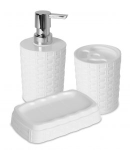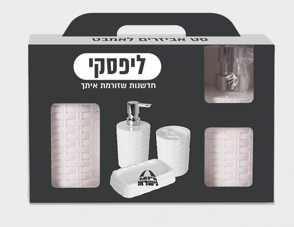 - סט מהודר לחדר הרחצה, הכולל סבוניה, כוס (למברשת ולמשחת שיניים) וכלי לסבון נוזלי, עם משאבת ניקל. לקבלת מראה טוטאל-לוק בחדר הרחצה, מומלץ לשלב מוצרים נוספים של ליפסקי במראה ראטן, בהם סט של פח אשפה ומברשת אסלה, סל כביסה, סלסלות תואמות ועוד. מחיר: 30 – 50 ש”ח.