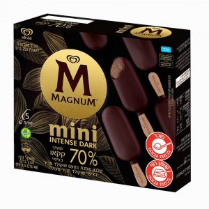 מאגדת מיני מגנום מריר Intense Dark: שלגון שמנת בטעם שוקולד מריר בציפוי שוקולד מריר מחיר: 27-30 ₪ ליחידה