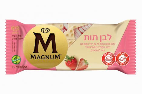 מגנום לבן תות: שלגון שמנת בטעם וניל עם ריפל בטעם תות בציפוי שוקולד לבן מעולה ושברי אגוזי לוז מסוכרים מחיר: 9-11 ₪ ליחידה