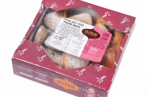 המוצר סגור באריזה קלה לפתיחה ולסגירה, אוזן המן במילוי שוקולד באריזה אישית סגורה, במחיר של 1 שקל בלבד!