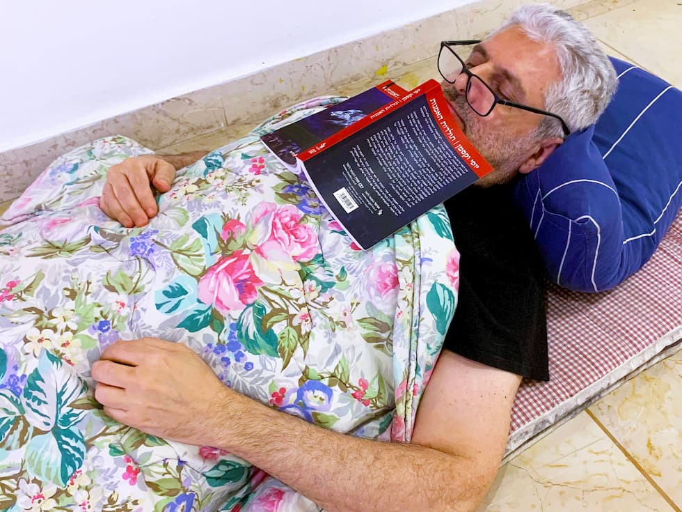 האמן והסופר יוסי וקסמן ישן בלילה שבין חמישי לשישי על רצפת המוזיאון בעין הוד מתחת לעבודותיו במוזיאון.