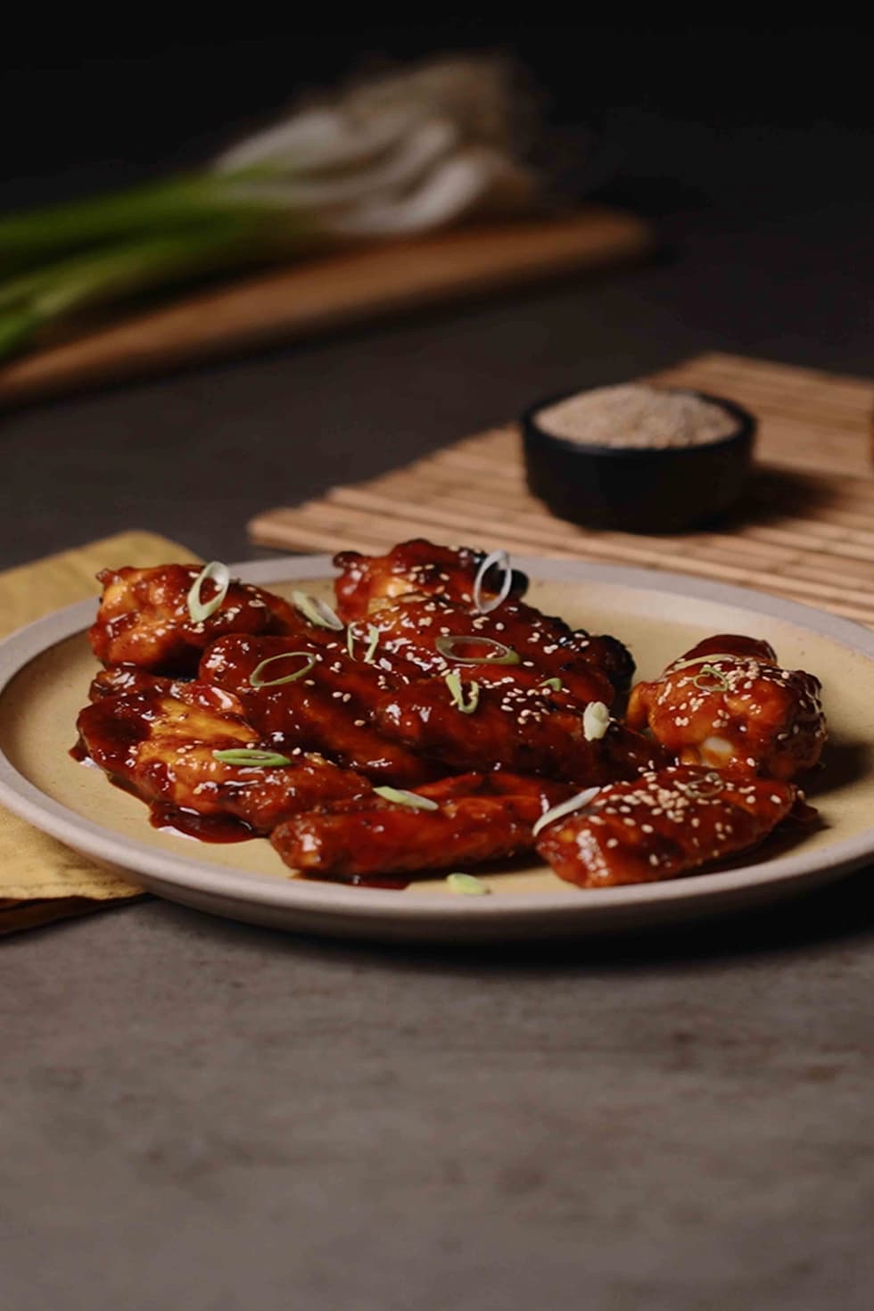 מייבשים את כנפי העוף במגבת נייר ומברישים אותם בשמן זית. מוסיפים מלח ופלפל ומצפים בקמח מעורבב בפפריקה. מסירים את עודפי הקמח וצולים במנגל על אש נמוכה במשך 10-15 דקות מכל צד או עד שהציפוי חום ופריך. בינתיים מערבבים בסיר את מרכיבי הרוטב הקוריאני עד לרתיחה. טובלים את כנפי העוף ברוטב, ומקשטים בבצל ירוק קצוץ ובשומשום לפי הטעם.