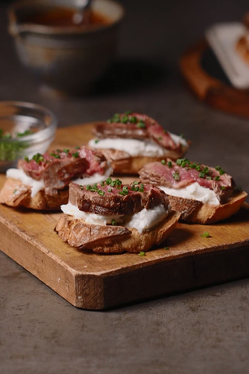מבשלים את שיני השום במחבת עם מעט שמן זית על אש נמוכה עד להזהבה. מסירים מהאש ומוסיפים את החומץ וכפית פפריקה. מבשלים את הבשר על המנגל, 5 דקות לכל צד על אש גבוהה. נותנים לבשר לנוח 10 דקות ופורסים. צולים את הבגט. מניחים על פרוסות הבגט את שכבה יפה של טחינה לבנה, חתיכת בשר וקורטוב של שום ושמן פפריקה.