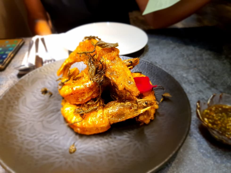 לאחר מכן הגיע שרימפס שלם טרי מטוגן בקמח אורז ופלפל סיני, רוטב סויה והדרים. השרימפס שמצופה היה בטמפורה דקדקה הגיע קריספי ופשוט כרסמנו ואכלנו בידיים כמו ילדים, בדיוק כמו שבפולניה אסור. גם זו, לא מנה למי שלא מוכן להתנסות בחוויות בלתי מוכרות.