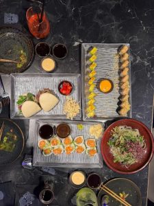 הגיעה לשולחן מנה שלא יכולתי להסיר את עיני ממנה: אטריות ופטריות עם מיקס של עלים ופטריות שיטאקי (65 ₪). אטריות שועועית במנה מושלמת שחובה לטעום אותה לכל סועד שמגיע למסעדה. התיבול נהדר, והשילוב של הטקסטורות השונות יוצר חוויה קולינרית מלאה. כשאנחנו במסעדה אסייתית, מתבקש להזמין סוגים שונים של סושי. ילדיי מטורפים על סושי, לכן לא הססנו והזמנו אינדיאן רול (67 ש”ח ), יאקי סלמון(67 ש”ח) ואוסאקה סלמון (71 ש”ח). אני רוצה לציין שהמנות גדולות מאוד ומגיעות בכלי הגשה נפלאים. הטעמים מעולים, הדגים טריים והילדים לא הפסיקו לאכול את המנות.